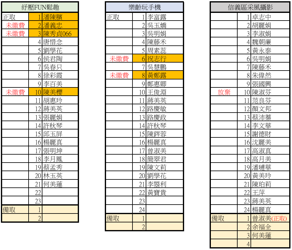 2/10第二階段報名已於上午結束,三個班(紓壓FUN鬆趣、樂齡玩手機、信義區采風攝影)的學員名單請見附圖。