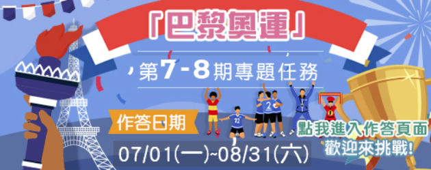 四、113年第7-8期專題任務主題為「巴黎奧運」,請鼓勵學生踴躍上網參加,作答日期為113年7月1日至113年8月31日止。