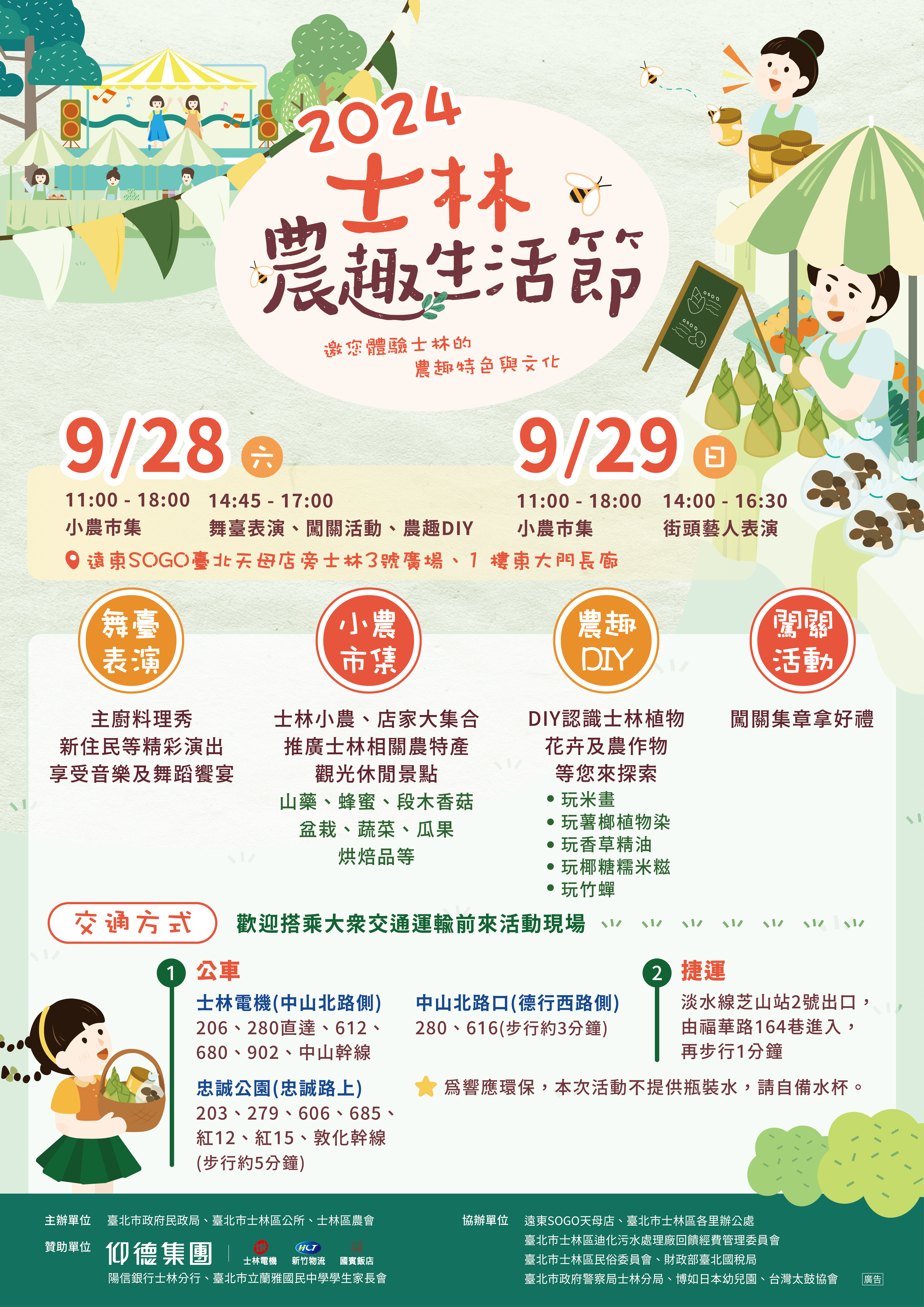 農趣文化,精彩無限!臺北市士林區公所將於113 年9月28日(星期六)及29日(星期日)11時至18時,在 遠東SOGO臺北天母店旁士林3號廣場與1樓東大門長廊首 次舉辦「2024士林農趣生活節」!本次活動由士林區公所與士林區農會攜手合作,精心規劃豐富內容,邀民眾 一起體驗士林的農趣特色與文化。9月28日(星期六)現 場不僅有小農市集,展示蜂蜜、段木香菇等農特產,還 有精彩的舞臺表演、新住民演出,以及各種趣味十足的 農趣DIY活動,如米畫、薯榔植物染、香草精油等,更有 闖關活動集章免費拿好禮! 9月29日(星期日)還有街 頭藝人快閃表演等您來欣賞。歡迎全家大小、親朋好友 相聚,共享這場農趣文化盛宴!詳細活動資訊請至士林 區公所網站查詢,或致電人文課28826200轉6504施小姐。