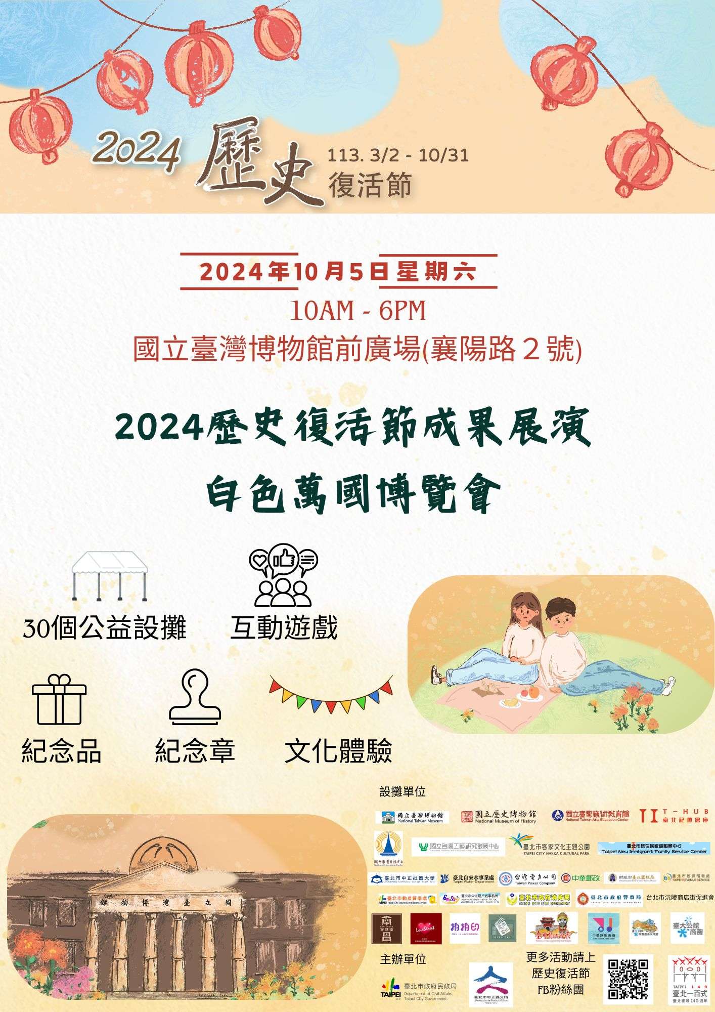 臺北市中正區公所將在113年10月5日(星期六) 上午10時至下午6時於二二八和平公園-國立臺灣博物館 本館(襄陽路2號)前廣場,舉辦 「2024歷史復活節- 白色萬國博覽會」,展演歷史復活節活動成果,特邀區 內各機關、博物館、古蹟場館等一起設置30個公益攤 位,邀請您一同品文化、玩體驗、拾回憶,感受獨特的 中正區地方特色!更多活動詳情請上歷史復活節FB粉絲 團(https://www.facebook.com/papagozhongzheng),或 上臺北市中正區公所網站基層藝文專區(https: //zzdo.gov.taipei/基層藝文)查詢。