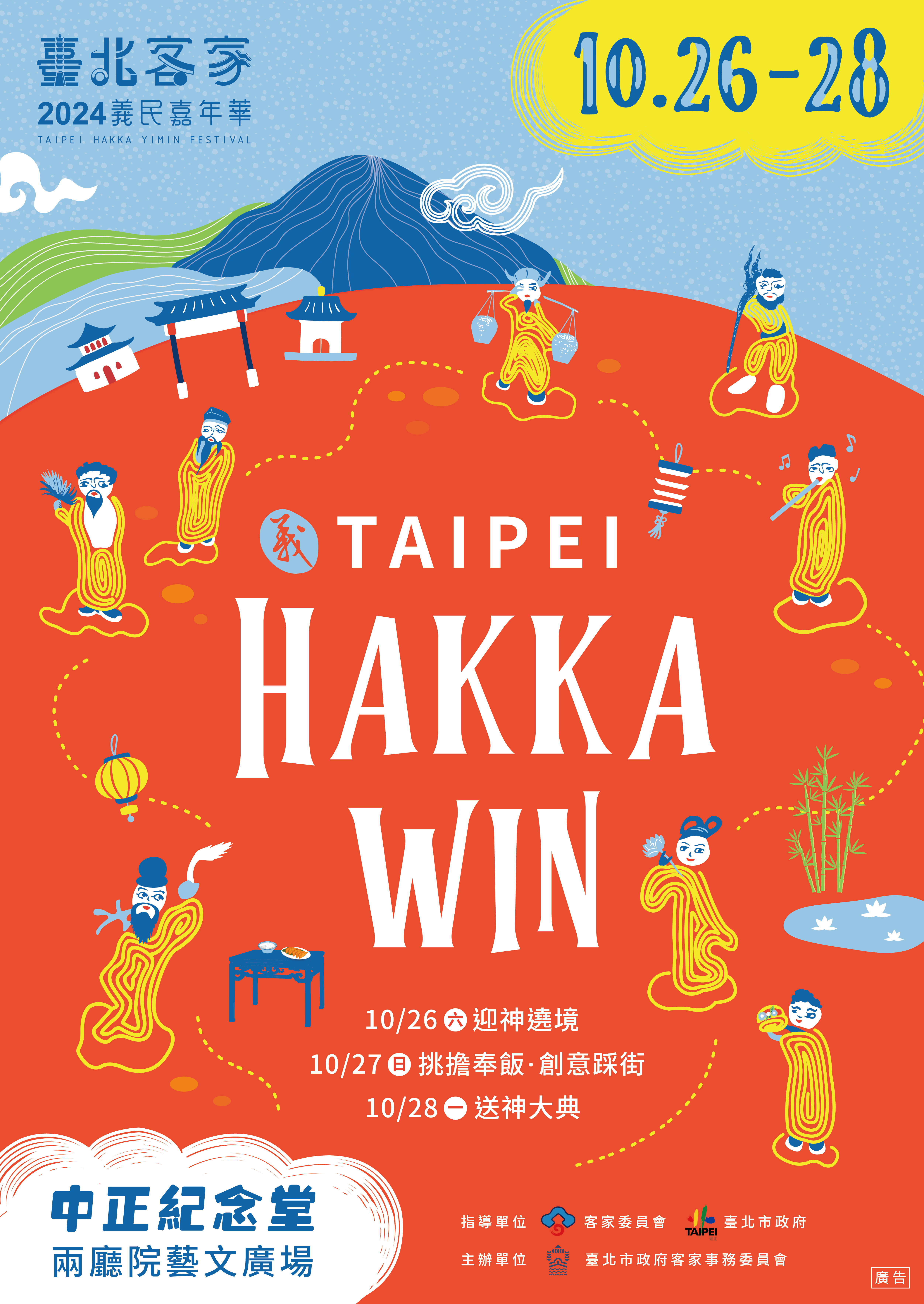 Taipei Hakka W in 2024 臺北客家義民嘉年華 1 0 月 2 6-2 8 日在中正紀念堂舉辦, 以充滿熱情活力的應援口號,邀請李多慧號召全民力量為客家加油打氣,活動內容有祭典、遊行、市集、展演, 臺北市客委會邀您 共下來尞 。