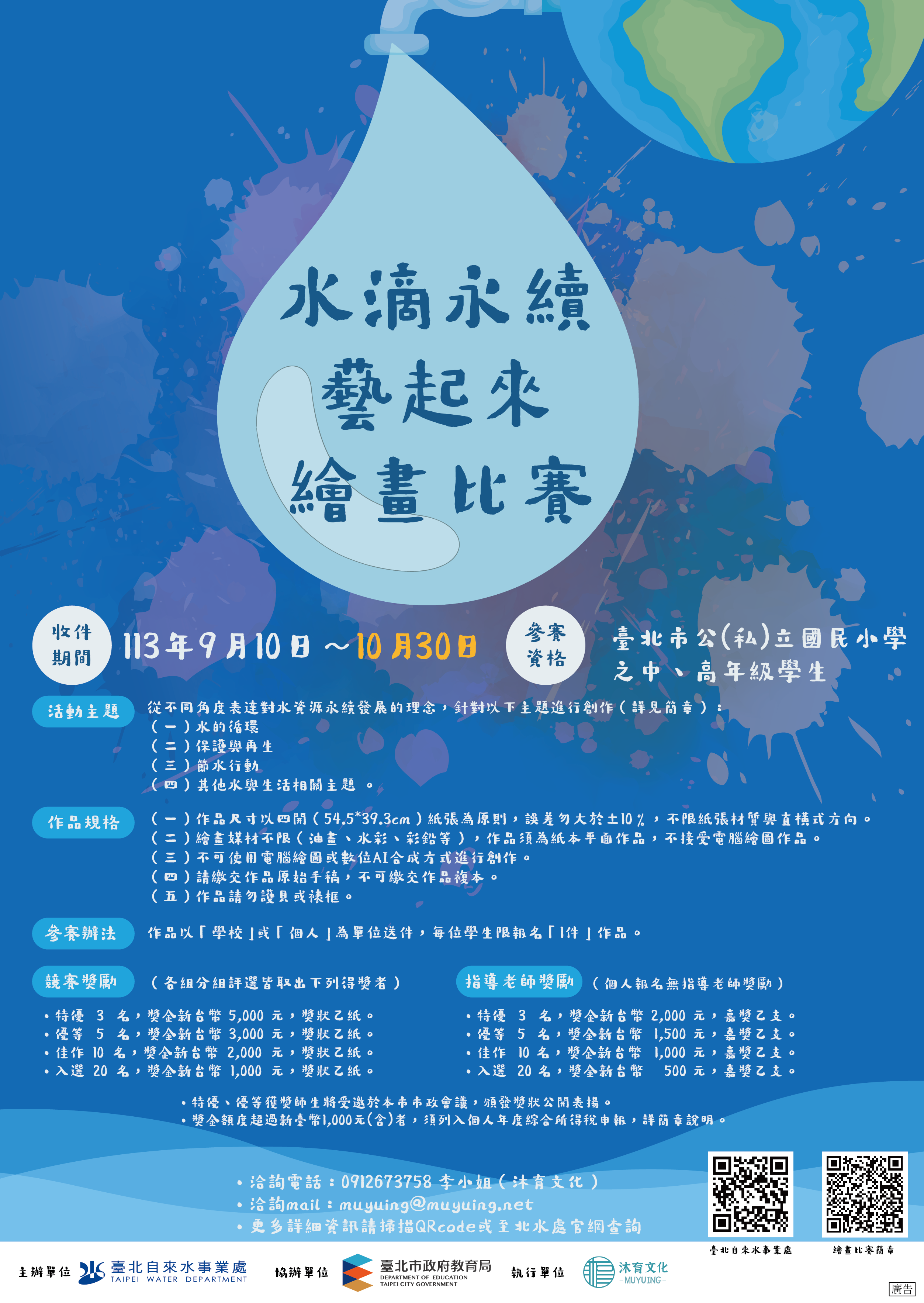 二、檢送113年「水滴永續藝起來」繪畫比賽簡章(修正版)及 海報各1份(如附件)。