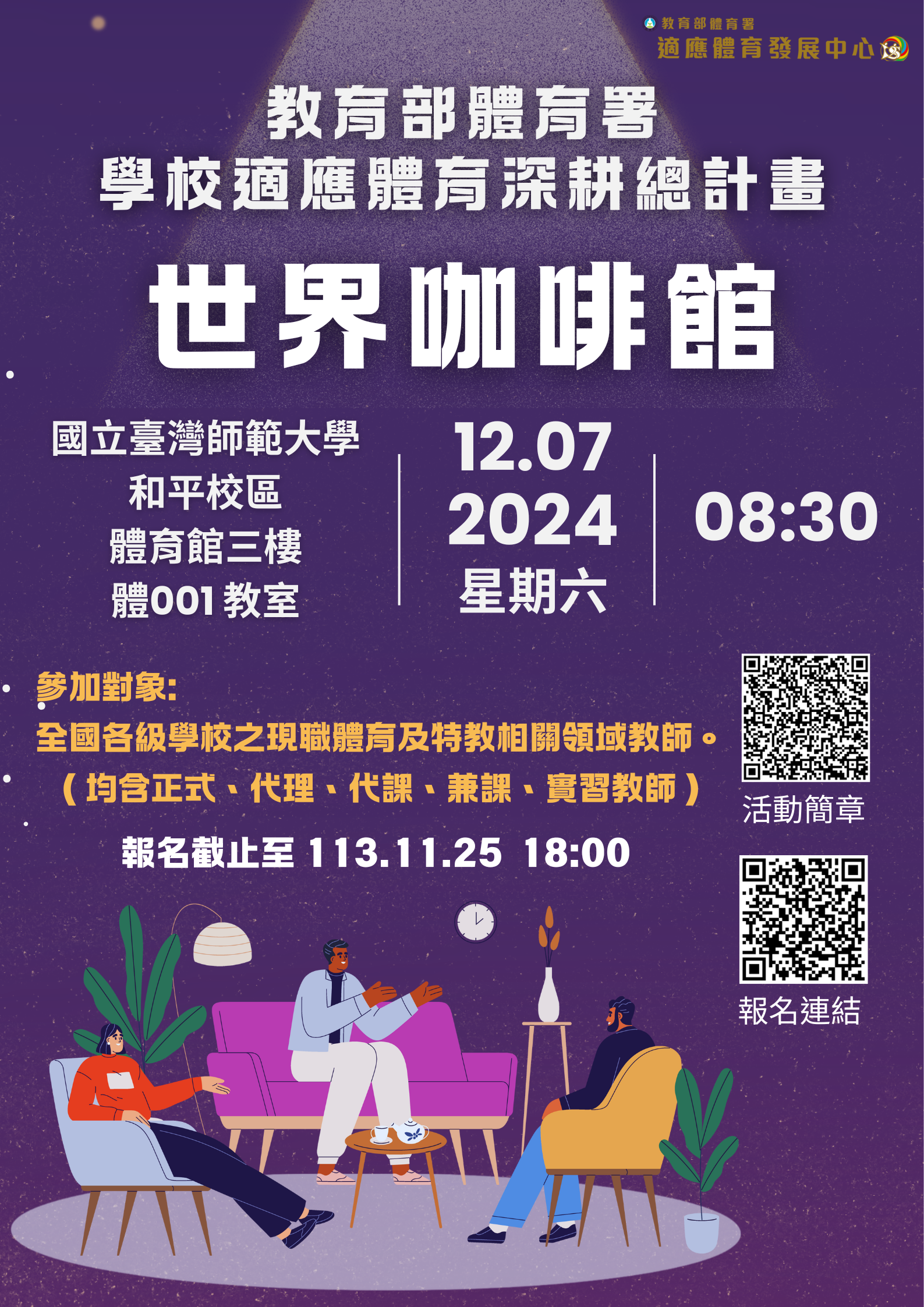 活動地點:國立臺灣師範大學和平校區I體育館3樓體001教室(臺北市大安區和平東路一段162號)