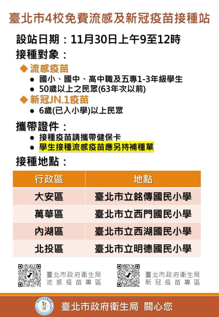 (二)接種站點—皆由本市聯合醫院辦理: 1、內湖區西湖國小。 2、北投區明德國小。 3、萬華區西門國小。 4、大安區銘傳國小。