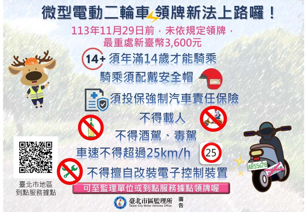 微型電動二輪車(原稱電動自行車)自113年11月30日起納管,未掛牌上路,警方將依法取締。