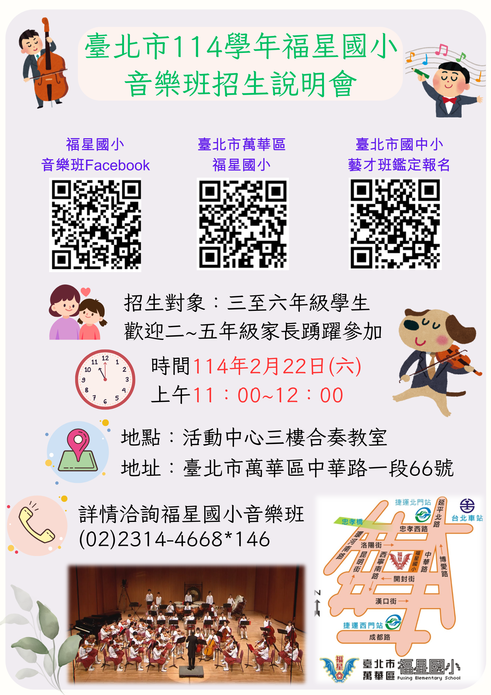 (三)活動內容:簡介該校藝術才能音樂班及114學年度入學考 試相關內容,並介紹音樂班教學環境與教育特色,以及 國中升學管道之最新資訊。