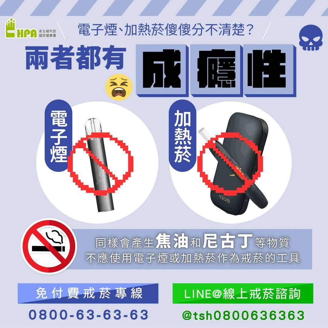 電子煙多含有尼古丁及有害致癌物,對使用者和暴露於二 手煙者都有害,更沒有證據證明電子煙是安全且可以幫助戒菸。另外,國外研究顯示,曾經使用電子煙的青少年會 有較高的吸菸意圖,且易開始有吸菸行為,青少年若曾使用過電子煙,其嘗試紙菸的機會是沒有使用過電子煙青少年的2倍以上,雙重使用對身體危害更甚,且更難以戒除。