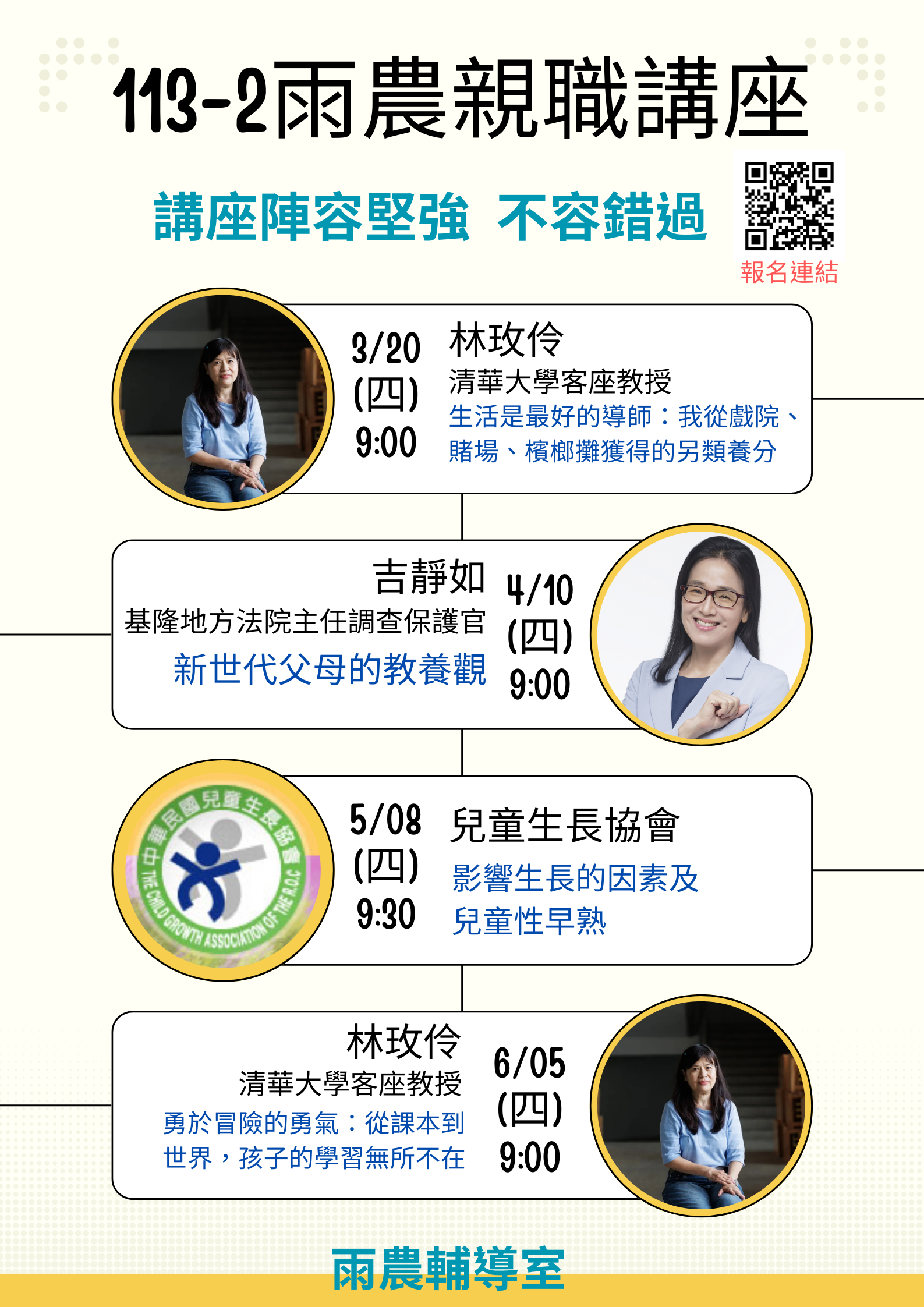 (四)6/5(四)9:00-11:30 林玫伶清大客座教授講題:「勇於冒 險的勇氣:從課本到世界,孩子的學習無所不在」。