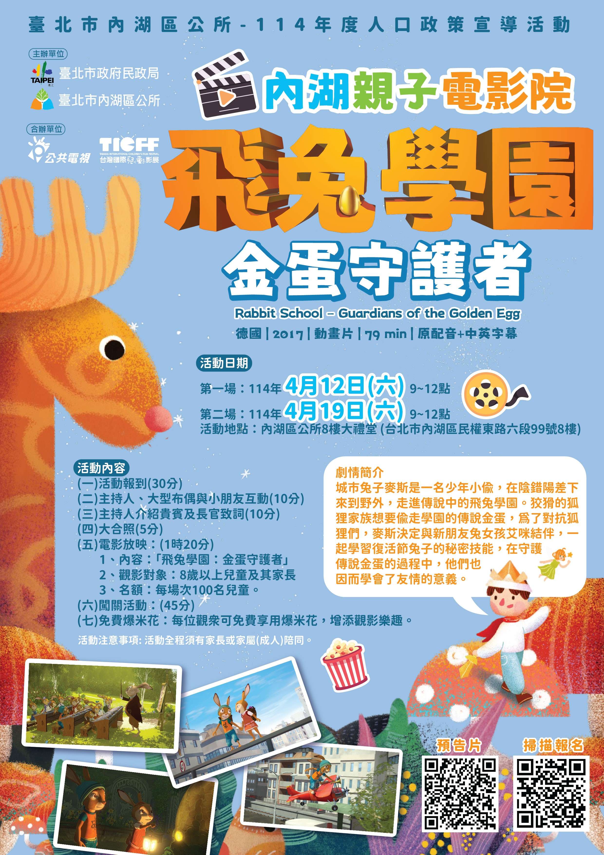 內湖親子電影院將於114年4月12日及4月19 日舉辦,