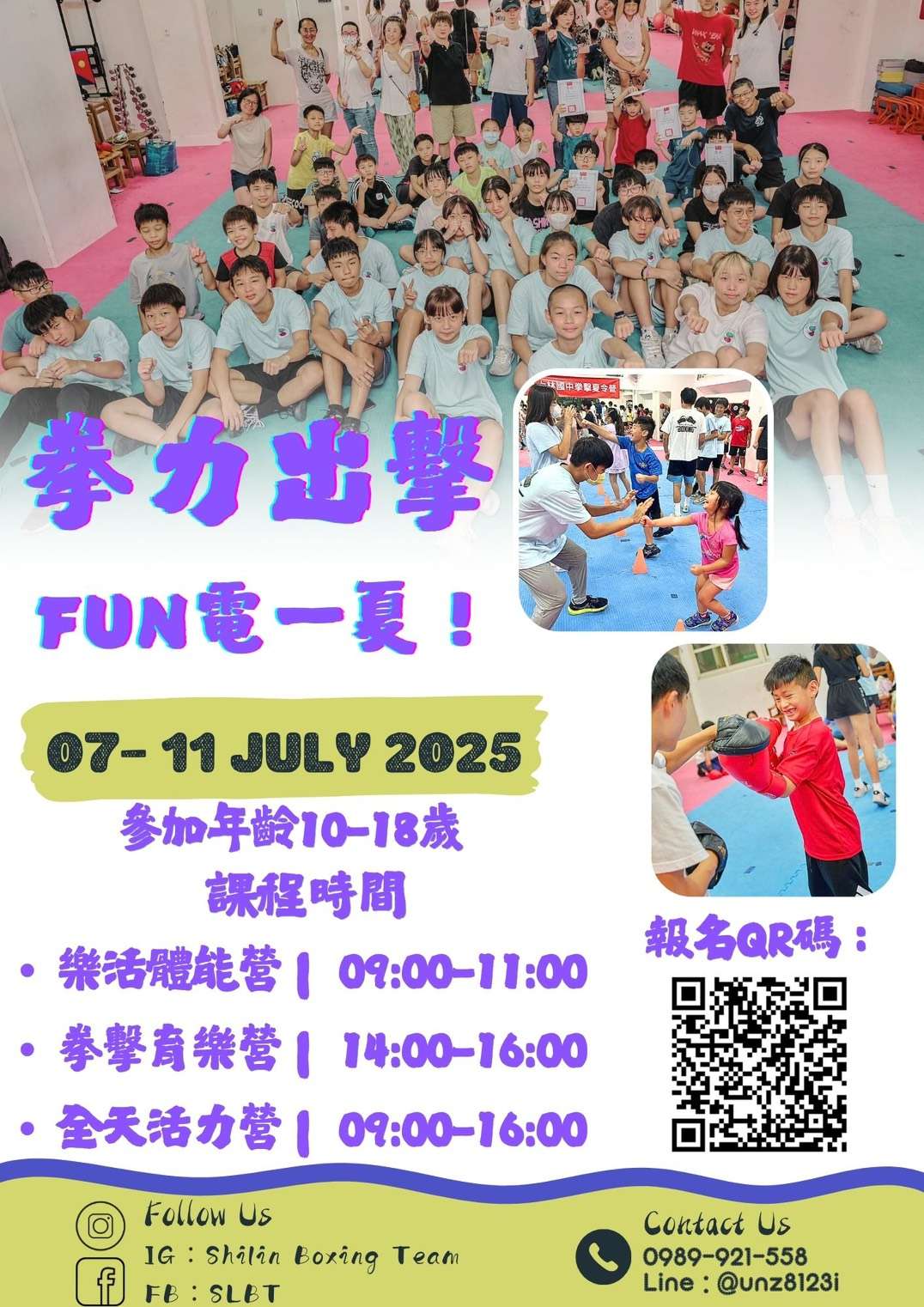 二、活動時間:(1)樂活體能營:114年7月7日至11日上午 09:00-11:00共計 5 天。(2)拳擊育樂營:114年7月7日至11日下午 14:00-16:00共計 5 天