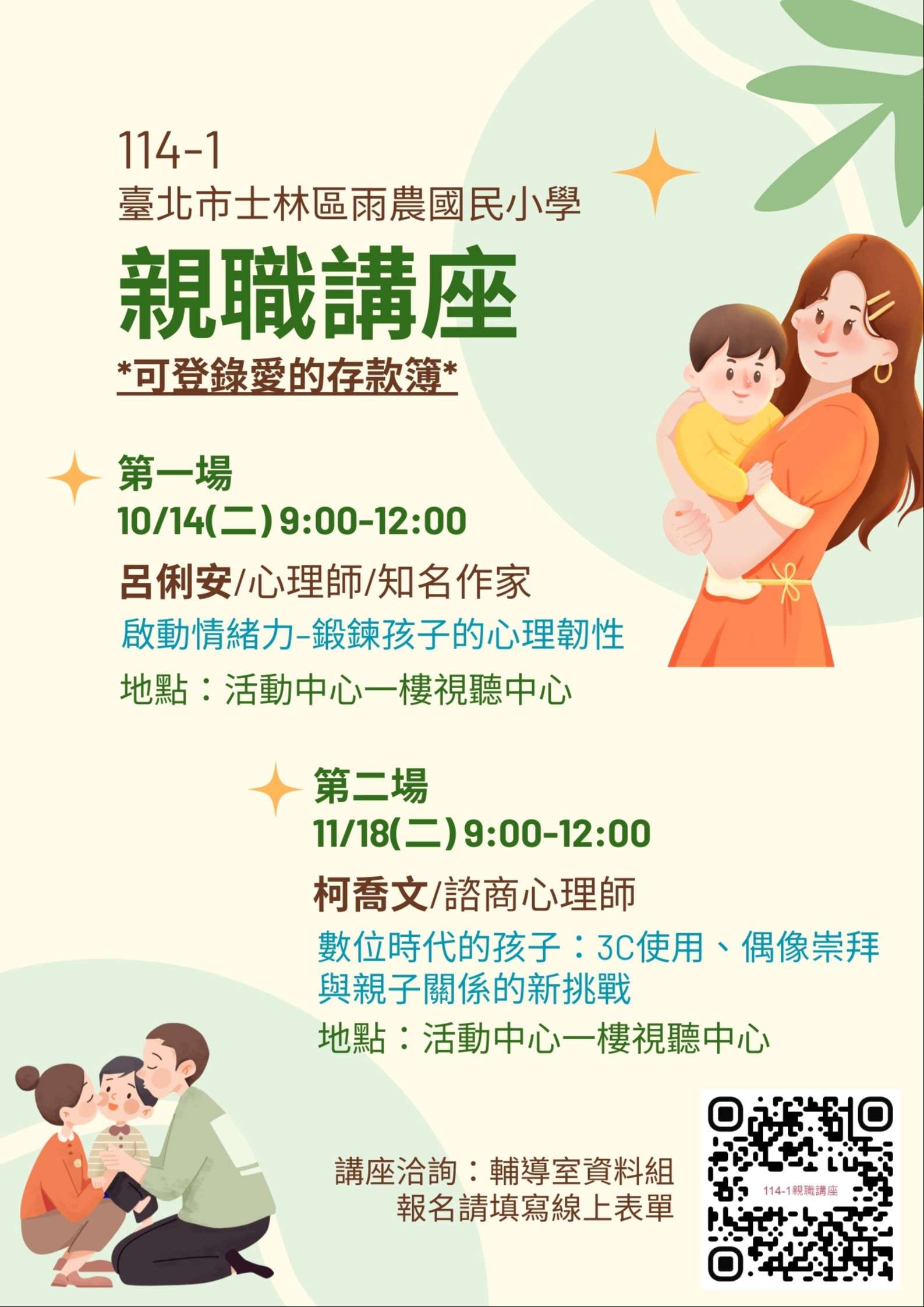 一、雨農國小10至11月共計辦理兩場親職講座課程,結合愛的存款 簿學習集點活動給予時數。講座課程內容如下: