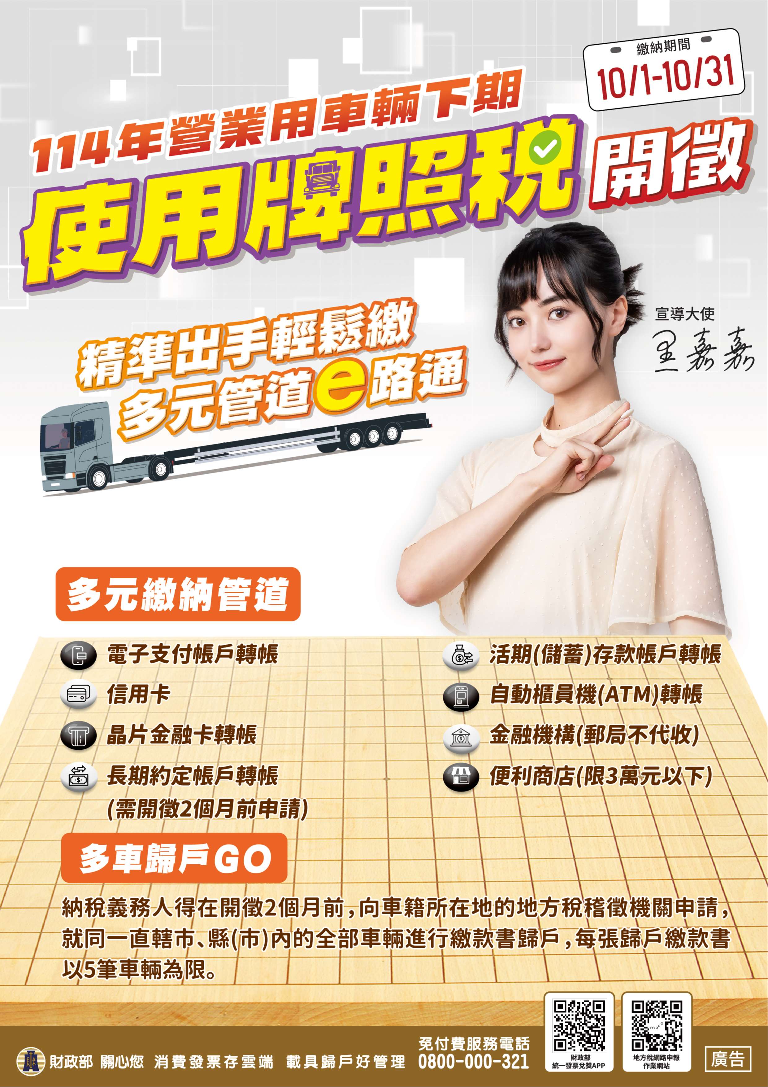 114年營業用車輛下期使用牌照稅於10月1日 開徵,繳納期限至10月31日,車主可申請同一縣市車輛之 使用牌照稅繳款書歸戶,每張繳款書可列示5筆車號,至 『地方稅網路申報作業入口網』點選『使用牌照稅歸戶申 請』即可線上申請歸戶。