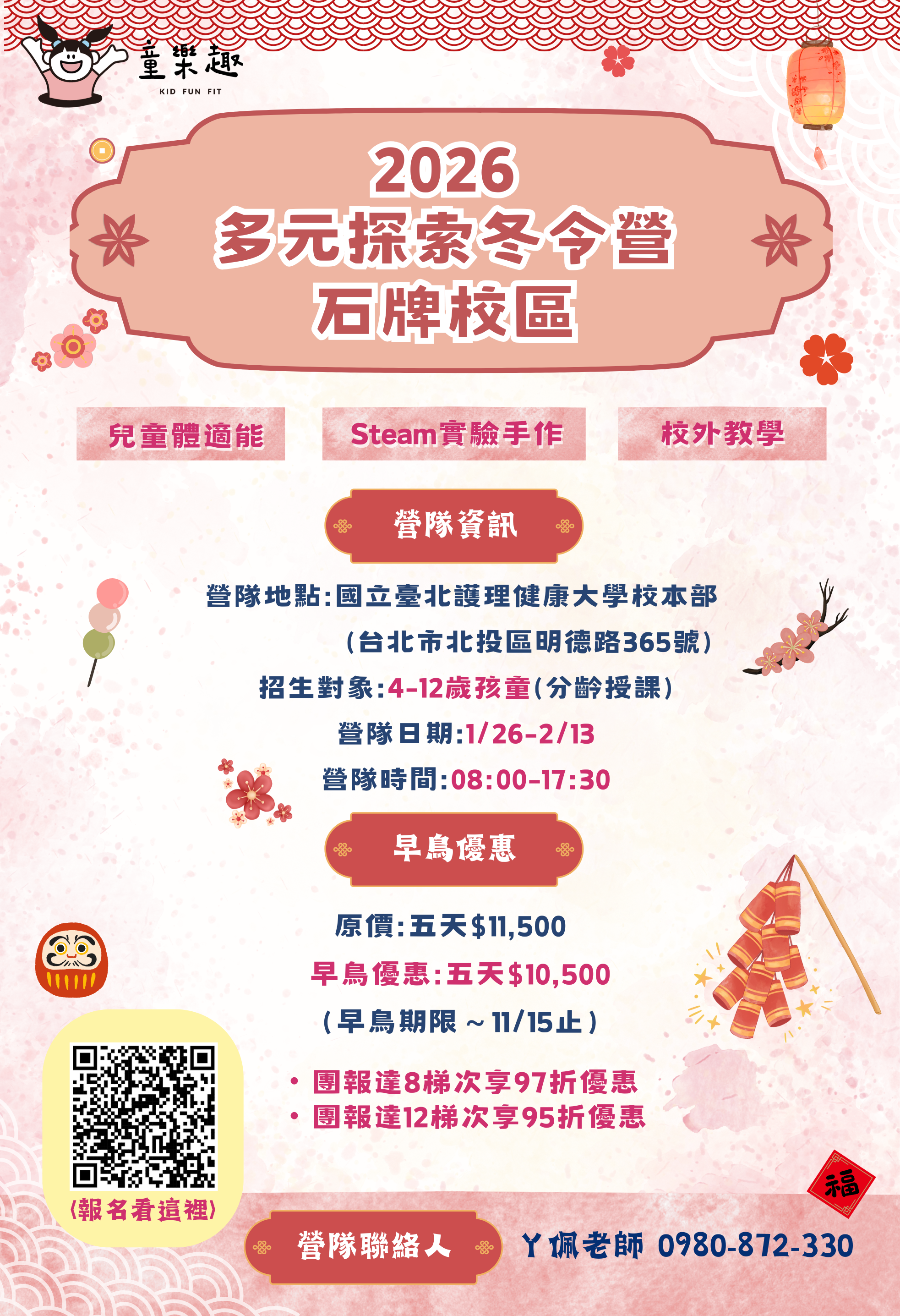 六、洽詢方式: (一)臉書:「Kid.fun.fit童樂趣/兒童夏令營冬令營/海龜營 /幼兒體能/親子團」粉絲專頁詢問 (https://goo.gl/dNm6LG) (二)LINE: @kidfunfit2018 (三)電話:0980-872-330 ㄚ佩老師