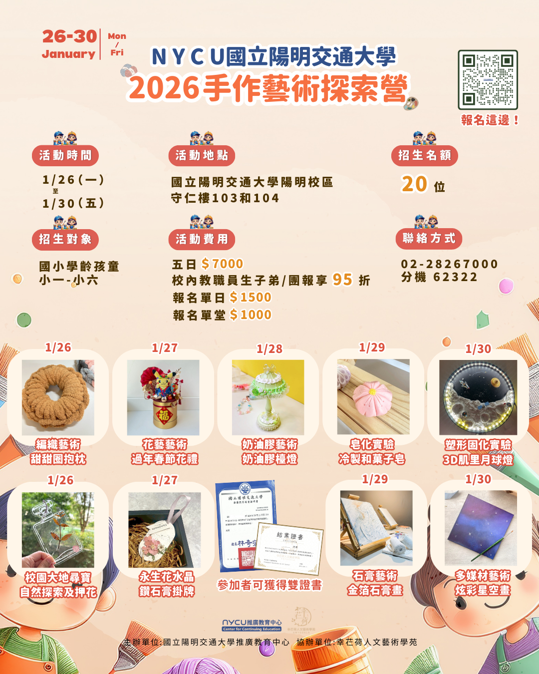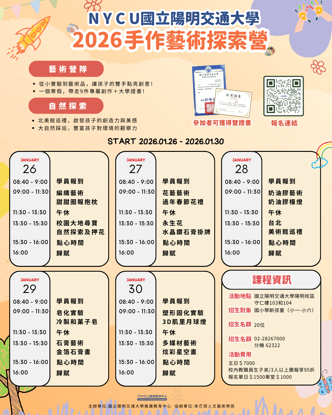 一、本校推廣教育中心將於115年寒假辦理「2026手作藝術探索 營」5日兒童課程,引導孩童探索手作藝術創作的樂趣。