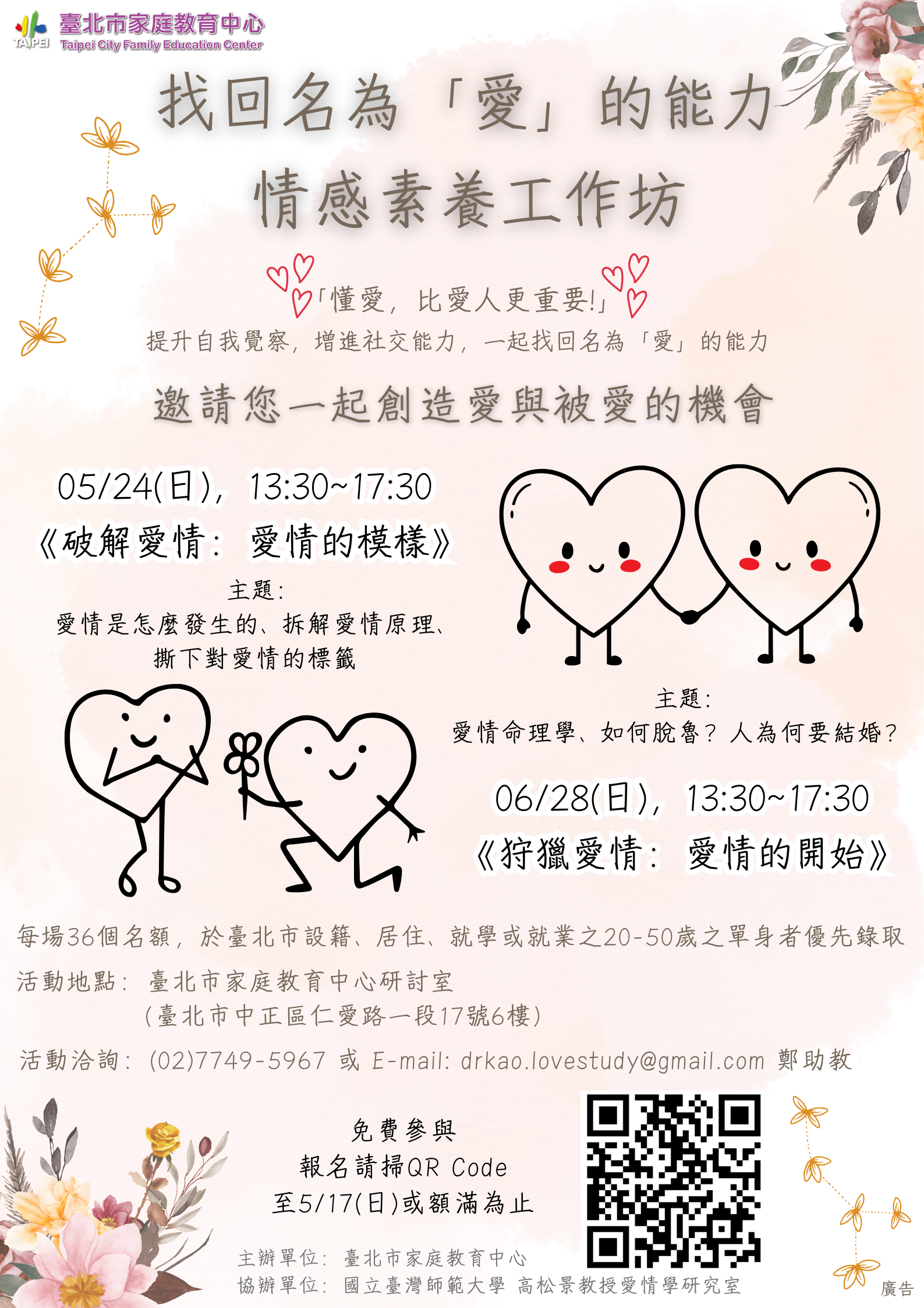 臺北市家庭教育中心115年度『找回 名為「愛」的能力—情感素養工作坊』,於5月24日及6月 28日(星期日)13時30分至17時30分假臺北市家庭教育中 心舉辦,活動名額為36人,歡迎年齡20歲以上至50歲之單身者踴躍報名參加(於本市設籍、居住、就學或就業者為 優先錄取),活動全程免費參與,詳細內容可於中心網站 (https://family.gov.taipei)課程與活動瀏覽及下載, 相關報名問題請寄信E–mail至drkao.lovestudy@gmail. com詢問」。