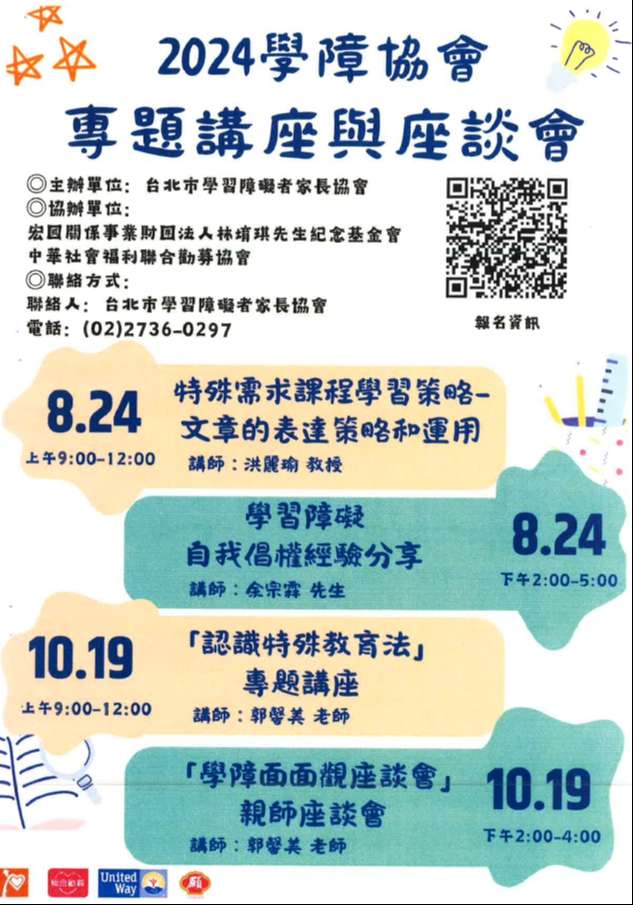 4、「學障面面觀座談會」親師座談會-113年10月19日 (星期六)下午2時至4時;財團法人林堉琪先生紀念 基金會(臺北市松山區光復北路191號)。