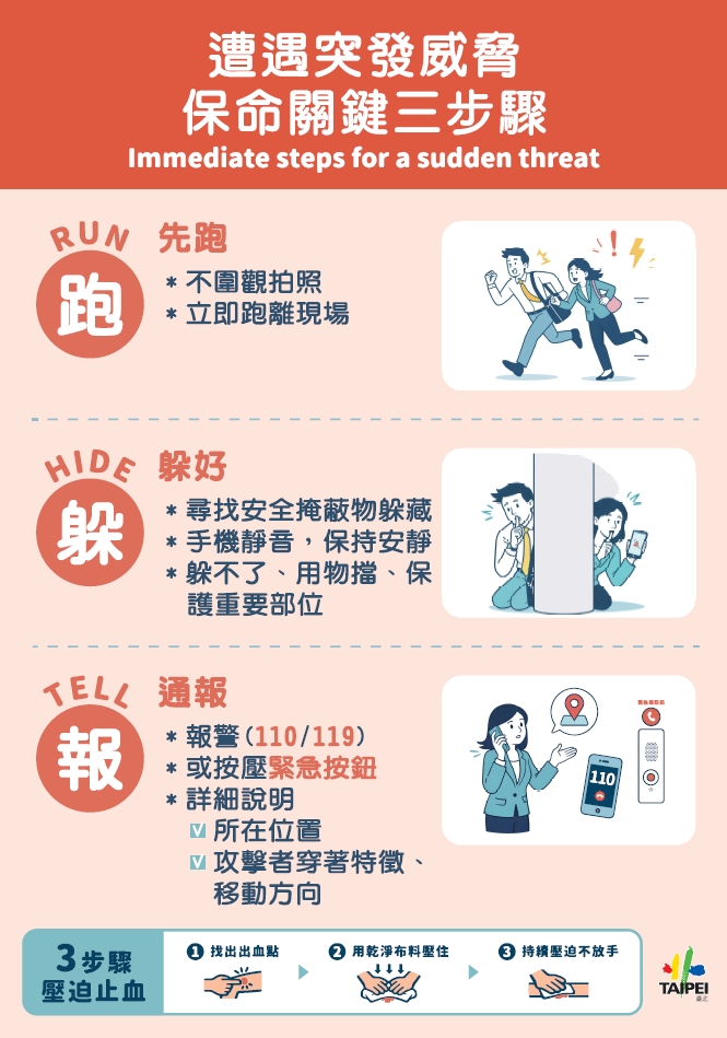 轉知「無差別攻擊事件全民應變指引」圖卡1份,如遇突發威脅,得依指引儘速躲避並隨時 留意周邊狀況,確保自身安全。
